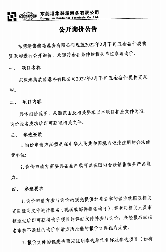 東莞港集裝箱港務有限公司2022年2月下旬五金備件采購公開詢價公告